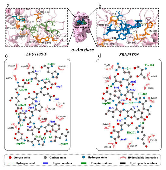 Three-dimensional and two-dimensional molecular docking diagram of the peptides of (a,c) LDQTPRVF and (b,d) SRNPIYSN with α-amylase.