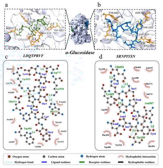 Three-dimensional and two-dimensional molecular docking diagram of the peptides of (a,c) LDQTPRVF and (b,d) SRNPIYSN with α-glucosidase.