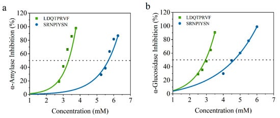 Inhibition activity of LDQTPRVF (Green line) and SRNPIYSN (Blue line) against (a) α-amylase and (b) α-glucosidase.