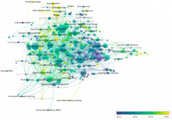 The study trends and topics with respect to fungal proteins (nutrition, function, health, safety, and sustainability) in the selected 10,000 studies, which were found in Web of Science during the period 2000–2024, were summarized using VOSviewer software (version 1.6.18, Leiden University, Leiden, The Netherlands). The minimum frequency of keyword occurrence was set as 10, and a clustering co-occurrence map was drawn. The results of the bibliometrics and visualization analysis were used to objectively list the current research status, hotspots, development background, and expected research topics in this direction. Each circular node represents a keyword, a line represents the co-occurrence relationship between the two keywords, and the color of the node represents different clusters. The results of the network visualization are presented in Figure 1. In the past five years, the research topics surrounding fungal protein have related to nutritional value, health benefits, alternatives, safety in food application, and functional properties including antioxidant and anti-inflammatory properties.