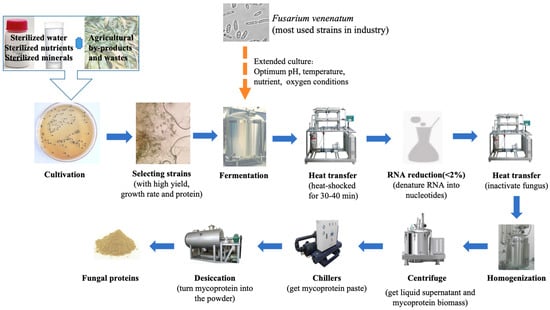 Fungal proteins can be produced in large quantities using industrial fermenters. Detailed steps are shown in Figure 2. First, strains are cultured in sterilized water, nutrient, and mineral combined substrates, such as agricultural by-products or wastes. Then, strains with a high yield, growth rate, and protein content are selected for further fermentation. Fungal solid-state fermentation has an impact on its protein contents, amino acid composition, protein bioaccessibility, the flavor of end products, and other aspects. Solid-state fermentation can promote the transition of fungi into enzymes and edible ingredients. Studies have confirmed that fungal solid-state fermentation can improve nutritional status and bioaccessibility [33]. In general, Fusarium venenatum is the most commonly used strain for industrial fungal protein production, because it has a variety of nutritional values, such as a protein content of more than 41%, dry biomass fat content of 13%, and dietary fiber content of 25% [34,35]. During the fermentation process, more glucose, oxygen, and ammonia are added to the fermenter to help the fungus continue to grow and produce further cultures. Optimal pH, temperature, nutrient, and oxygen conditions are required in this step. The pH of the culture solution is generally adjusted using citric acid or sodium hydroxide. Fusarium utilizes nitrogen to produce amino acids, and then further synthesize proteins. Oxygen and glucose promote the aerobic respiration of fungus. After the fermentation process is complete, the broth is first heated in heat shock for 30–45 min above 68 °C, which prevents fungal growth and breaks down the ribosome, hydrolyzing the RNA to nucleotides to ensure that the nucleic acid content is below the WHO recommended intake of 2% w/w [36,37]. During this process, exogenetic nucleotidase is sometimes added to further break down the RNA. The resulting broth is then heated in a second step at 90 ℃, inactivating the fungus by altering its cellular structure and function, followed by homogenization and then centrifugation [38]. After centrifugation, the liquid supernatant and sediment are harvested. The sediment is a fungal protein biomass, which can be further processed into meat replacement products [39]. Subsequently, the sediment and supernatant are dried, and the drying step is essential for maintaining protein quality. At higher moisture levels, the availability of water for hydrating the reactants is sufficient to increase the reaction rate, which also increases the rate of diffusion of the reactant and might improve the solubility of the reactant [40]. Finally, the fungal protein biomass is further cooled to obtain fungal protein.