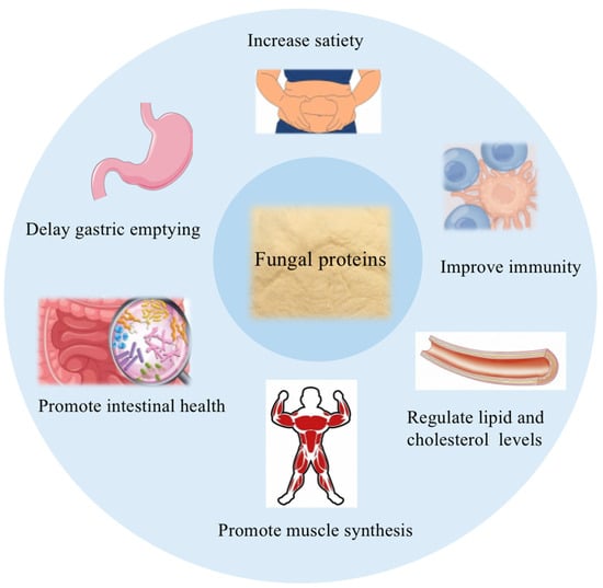 Figure 3 illustrates the health benefits of fungal proteins. Digestibility is an important indicator of protein bioavailability, and proteins with digestibility are usually associated with superior health; for example, faster protein digestion is linked to muscle anabolism. The products produced during protein digestion mostly depend on the structural attributes of foods, including the dissolvability of the protein, the availability of digestive enzymes, the protein sources of the food, and its processing attributes [74]. Fungi are easy to digest as the chitin wall provides a source of dietary fiber [75]. It has been found that the absorption kinetics of fungal proteins and the rising rate of EAAs in plasma are slower than those of milk, which is mainly due to the fiber content of the fungal protein cell wall affecting people’s digestive processes, such as delaying gastric emptying and facilitating the gastrointestinal tract absorption of nutrients [76]. Dunlop et al. investigated the impacts of fungal protein intake on acute postprandial hyperaminoacidemia and hyperinsulinemia in 12 healthy young men and found that the ingestion of fungal protein, a bioavailable source of insulin-stimulating dietary protein, led to slower but more persistent hyperinsulinemia and hyperaminoacidemia compared to milk [77]. Further, in a randomized controlled trial, researchers found that fungal protein reduced energy intake by 10% and insulin release (lowering insulin concentrations by 8%) in overweight people and regulated appetite compared with chicken [78]. In addition, fungal protein in the diet reduces energy intake in lean individuals. Clinical studies have shown no gastrointestinal discomfort or other adverse impacts during fungal protein interventions, and fungal-protein-based food substitutes are generally well-tolerated [79]. Colosimo et al. simulated in vitro digestion experiments showing that α-amylase hydrolyzed endocellular glycogen in fungal protein mycelia, and the concentration of glycogen amylase products in digestive fluid increased with digestion time. Moreover, the existence of fungal cell walls lowered the dynamics of reducing the sugar release during the digestive process compared to extracted glycogen [23]. Overall, fungal proteins have better digestive properties and are tolerated by patients with gastrointestinal function disorders.
