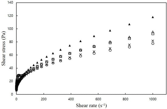 All mixtures exhibited a gradual decrease in the rate of shear stress increase as the shear rate increased, indicating shear-thinning behavior. Moreover, the addition of NaCl led to an increase in shear stress (Figure 1), but there were no significant differences in viscosity among the samples.