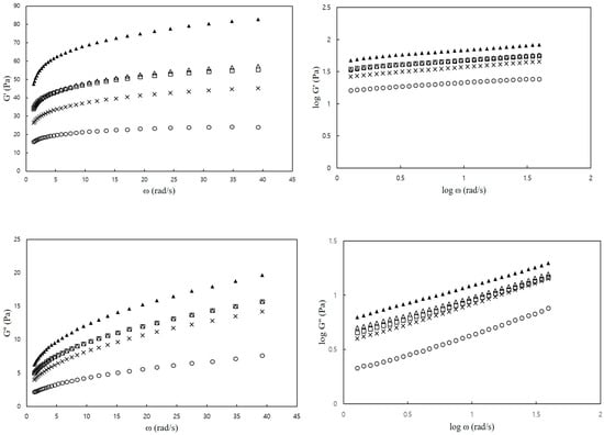Plots of G′ and G″ versus ω (frequency) of CS–MC mixtures with different NaCl concentrations (○: 0% NaCl, ×: 1% NaCl, □: 2% NaCl, ∆: 3% NaCl, and ▲: 4% NaCl).