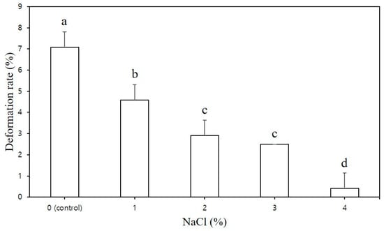 Deformation rate of the 3D-printed CS–MC paste with different NaCl concentrations. Different letters above the bar indicate significant differences among samples (p < 0.05).