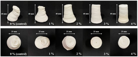 Figure 3 illustrates the dimensional stability of the CS–MC–NaCl pastes. To effectively assess the impact of NaCl concentration on printing performance and dimensional stability, the height of the 3D-printed sample was set at 40 mm. The deformation rate of the CS–MC mixtures significantly decreased as the NaCl concentration increased (Figure 3). In contrast, the control group exhibited low stability, with a deformation rate of 7.08%. This was due to inadequate vertical stacking during printing, resulting in a gradual collapse of the shape. Moreover, weak interlayer bonding in the control led to the formation of empty spaces on the surface, preventing the accumulation of layers and resulting in uneven lines.