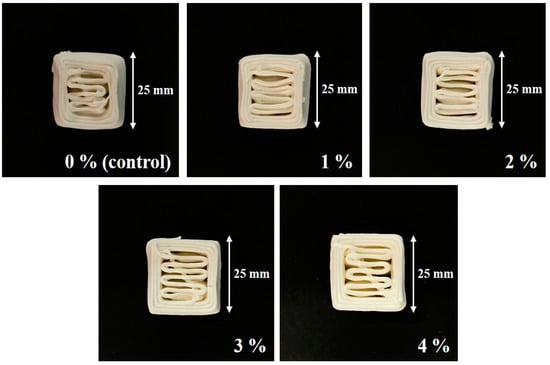 Figure 5 illustrates a 3D-printed product in the aforementioned shape using the CS–MC paste with varying concentrations of NaCl. It was observed that the addition of NaCl improved the accuracy of 3D-printed samples, showing that the filling lines within the printed cubes appeared most stable and clean-cut in the case of the 4% NaCl sample. It is believed that the presence of NaCl interfered with starch moisture absorption, rendering the paste softer and facilitating smooth extrusion through the nozzle. This resulted in high printing accuracy without loss of shape [48,49].