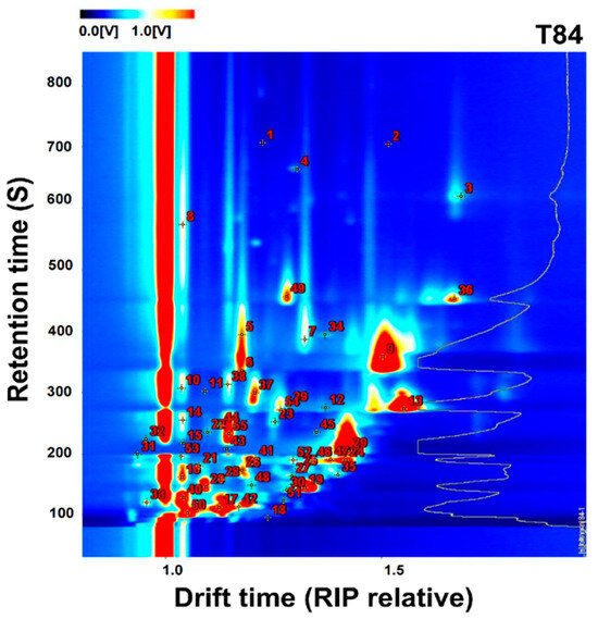 - Gao, L.; Zhang, L.; Liu, J.; Zhang, X.; Lu, Y. Analysis of the volatile flavor compounds of pomegranate seeds at different processing temperatures by GC-IMS. Molecules 2023, 28, 2717. [Google Scholar] [CrossRef] [PubMed]