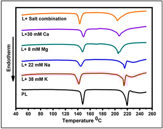Lactose, being a hydrophilic molecule, is enveloped by a hydration layer []. Consequently, during nucleation, the water molecules in the hydration layer of lactose undergo de-solvation, thereby enabling lactose–lactose interactions that culminate in the creation of the crystal lattice. The presence of a cation may enhance the bonding between these hydration water molecules and the lactose molecules, thereby impeding the evaporation of these water molecules. This is demonstrated by an increase in water evaporation enthalpies in the presence of different cations, as shown in Table 2. In this table, the greatest enthalpy of 167 J/g for the loss of crystalline water from crystal lattice was obtained for the PL. All other measured enthalpies obtained in the presence of different cations as well as their combination were reduced, indicating the obstruction of water removal from the crystal lattices [].