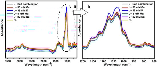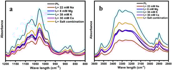FTIR spectra obtained from the concentrated lactose solutions in the presence of 8 mM Mg, 30 mM Ca, 38 mM K, 22 mM Na, the salt combination, and pure lactose (PL) in the ranges of 4000–600 cm−1 (a) and 1200–800 cm−1 (b).