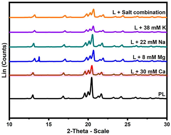X-ray diffraction patterns of lactose crystals with the addition of 8 mM Mg, 30 mM Ca, 38 mM K, 22 mM Na, salt combination, and pure lactose (PL).