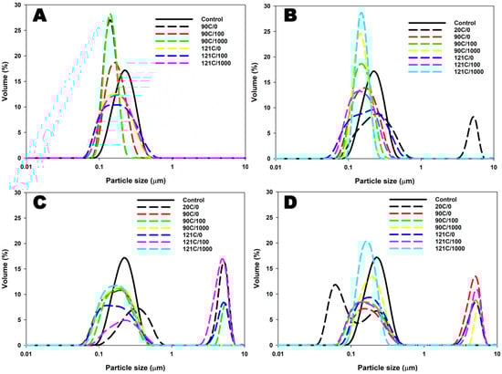 Particle size distribution of chocolate flavoured MPC suspensions without κ-carrageenan (A) and with κ-carrageenan concentrations of 0.01% (B), 0.03% (C), and 0.05% (D) processed under different temperatures (20, 90, or 121 °C) and shear rates (0, 100, or 1000 s−1).