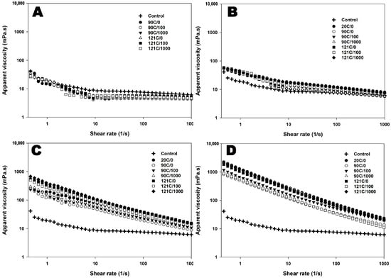 Apparent viscosity of chocolate flavoured MPC suspensions as a function of shear rate (0, 100, or 1000 s−1) applied during heating at 90 °C for 5 min or 121 °C for 2.6 min at 0% κ-carrageenan (A), 0.01% κ-carrageenan (B), 0.03% κ-carrageenan (C), or 0.05% κ-carrageenan (D). The viscosity measurements were completed after the treatments at 20 °C.