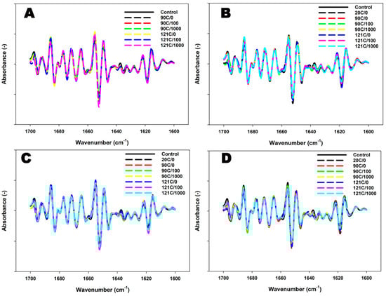 FTIR spectra (second derivative) for the Amide I region of chocolate-flavoured MPC suspensions without κ-carrageenan (A) and with κ-carrageenan concentrations of 0.01% (B), 0.03% (C), and 0.05% (D) processed under different temperatures (20, 90, or 121 °C) and shear rates (0, 100, or 1000 s−1).