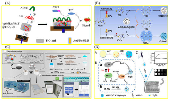Hydrogel biosensor based on inhibition of AChE via OPPs. (A) Fabrication of an AuNRs@MS nanoparticle−doped AChE biosensor and its working mechanism for ATCl. Reproduced from [53], with permission from Elsevier, 2019. (B) Sensing mechanism for pesticides using AChE−MnO2@HPH. Reproduced from [59], with permission from Elsevier, 2022. (C) Schematic illustration of the target−responsive hydrogel smartphone sensor for accurate on−site monitoring of OPPs. Reproduced from [57], with permission from Elsevier, 2021. (D) Schematic diagram of detection of OPs and D−AAs Based on MOF−Pt−enhanced long−lasting CL of ABEI/Co2+/CS hydrogels. Reproduced from [56], with permission from RSC, 2020.
