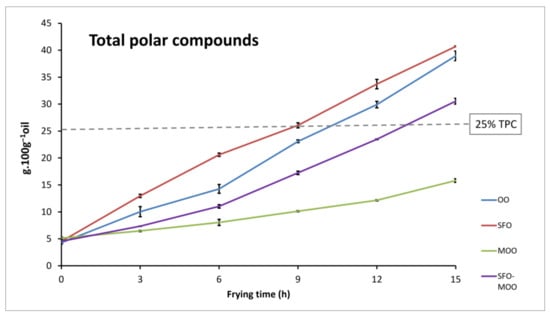 Total polar compounds in the oil (g 100 g−1) during the frying time.