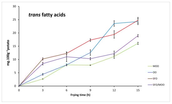 Oleic acid was the major FA present in potatoes fried in OO and MOO, as expected from their high-oleic composition, with no significant difference (p < 0.05), except at 15 h where oleic acid showed a significant decrease for potatoes fried in OO, indicative of higher fatty-acid loss, potentially by oxidation. Regarding potatoes fried in SFO, the prominent FA quantified was linoleic acid, followed by oleic acid. Blending 20% MOO with 80% SFO increased significantly (p < 0.05) the amounts of oleic acid in all fried potato samples. Linolenic acid was quantified in vestigial amounts for all the samples, independently of the oil. Globally, oxidation of the frying oils can be deduced in all potato samples from the decrease in UFAs through the frying time against a more stable trend for saturated ones. Trans fatty acids (TFAs), formed during high thermal processing and indicators of oil degradation, were present in fried potato samples in very low quantities (<0.1%), increasing slightly with frying time (Figure 2) but without statistical differences within the first 9 h of frying.