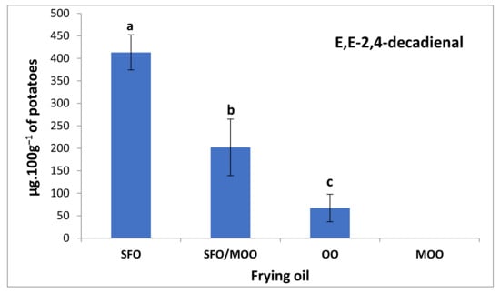 Differences in E,E-2,4-decadienal amounts in deep-fried potatoes after 9 h of heating. Letters a–c indicate a significant difference between potatoes fried on different vegetable oils.