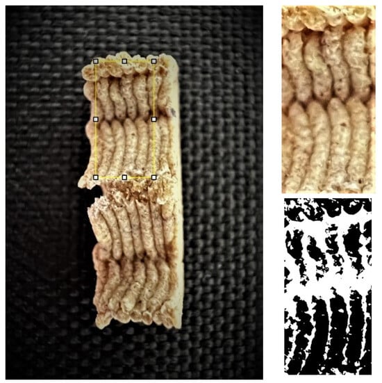 Porosity assessment of an example snack (printed with 20% infill density and post-processed in an air fryer): selection on a cross-section of the whole sample (left); cropped and magnified selected part (upper right); and pore area assessment (white area) on a binary 8-bit picture (below right).