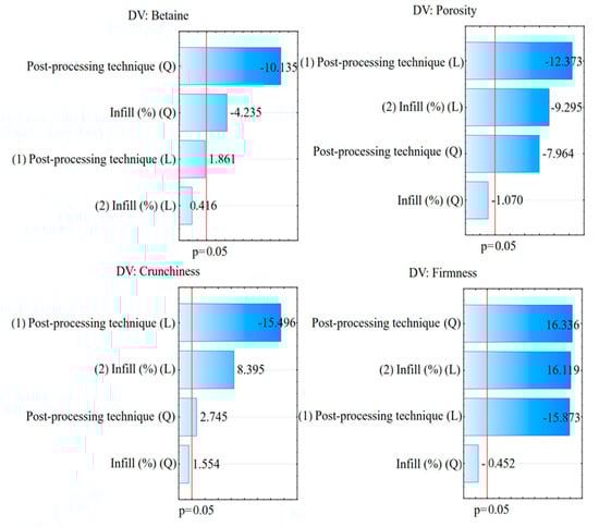 Pareto charts for the estimation of independent variables (post-processing technique and infill) on: betaine, porosity, crunchiness, and firmness. Higher values of standardized effect estimates represent a more pronounced effect on the response. Red lines represent the p = 0.05 probability level; all values situated on the right of the red lines represent significant effects, while the values on the left represent effects with no statistical significance. Letters L and Q in the brackets represent the estimation of the linear (L) and the quadratic (Q) effect.