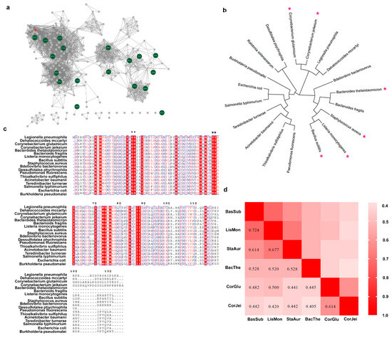 The procedure for mining of novel L-aspartate α-decarboxylase employing SSN analysis and sequence alignment. (a) Sequence similarity network of L-aspartate α-decarboxylase retrieved from UniProtKB in precision mode. The green nodes stand for the selected sequence for the following analysis. (b) Phylogenetic analysis of L-aspartate α-decarboxylase from eighteen sources. The red asterisks represent the sources for the next pairwise alignment. (c) Multiple-sequence alignment of diverse L-aspartate α-decarboxylase. Highly conserved residues are denoted in red boxes, and the residues associated with catalysis are denoted by black dots and asterisks. (d) Pairwise alignment of L-aspartate α-decarboxylase from eight sources. BacSub stands for enzymes from Bacillus subtilis. Similarly, LisMon stands for Listeria Monocytogenes; StaAur stands for Staphylococcus aureus; BacThe stands for Bacteroides thetaiotaomicron; CorGlu stands for Corynebacterium glutamicum; CorJei stands for Corynebacterium jeikeium. The numbers in the boxes represent the sequence homology of L-aspartate α-decarboxylase between the two sequences.
