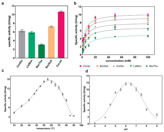 To discover novel ADCs, a BLAST search across Uniprot database was first performed using L-aspartate α-decarboxylase from C. glutamicum as a probe. Then, 412 candidate sequences were retrieved from the database. To further analyze these sequences, the EFI-EST web tool was employed to generate a sequence similarity network (SSN) [31,32]. The sequences on the SSN were classified into six distinct clusters. We selected nineteen sequences from these clusters, and the sequence identity was higher than 40% in the sequence alignment. We then used these sequences to construct a phylogenetic tree using the maximum-likelihood method in MEGA 7 software (ver. 7) (Figure 1b). Additionally, we performed a protein sequence alignment to further analyze the sequence data (Figure 1c). The results revealed that the L-aspartate α-decarboxylase probe, encoded by the panD gene of C. glutamicum, was in a different evolutionary lineage from that of B. subtilis, despite both enzymes belonging to the pyruvoyl-dependent enzyme class. However, both enzymes shared the G24-S25 conserved motif, involved in cleaving [1,11], and T57-Y58, involved in catalysis [11,33]. Given that the ADCs from these two sources displayed different enzymatic activities, we speculated that the enzymatic properties were not closely related to the evolutionary relationship shown on the phylogenetic tree. Therefore, due to their superior enzymatic activity, we selected six sequences, including those from both C. glutamicum and B. subtilis, for further characterization. We compared the sequence conservation using pairwise alignment and found that these sequences exhibited high or medium conservation. Subsequently, we chose four typical sequences from different lineages related to B. subtilis and C. glutamicum for additional characterization.