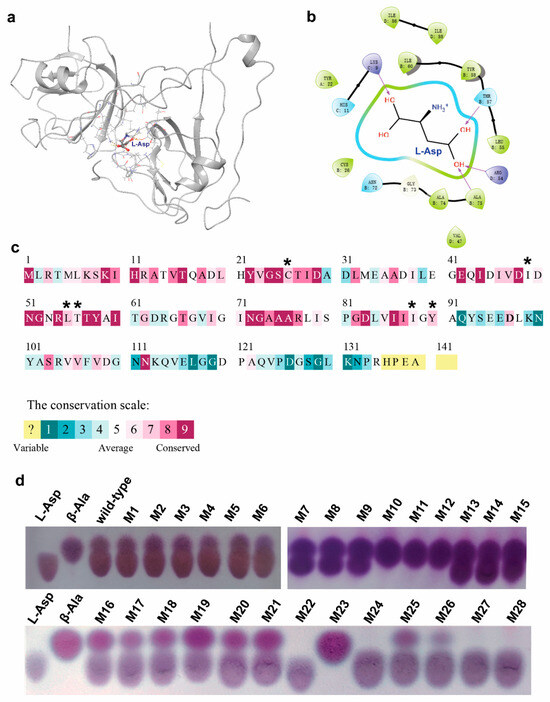 Through the modified Combinatorial Active-site Saturation Test (CAST) method, the selected sites were mutated using saturation mutation using NNK degenerate primers. After reverse PCR, E. coli BL21 (DE3) was transformed, and the single colonies were selected from the plates and then inoculated into a 96-well plate. After 16 h induction, the plates were centrifuged, and the supernatants were discarded. Then, L-aspartate sodium with a final concentration of 500 mM was added to the plates and incubated at 37 °C for 30 min. Afterward, the reactants were centrifuged, and the supernatants were then placed on the thin plate and screened using thin-layer chromatography. The mutants with higher levels of β-alanine were selected, and the mutated sequences were determined through sequencing.