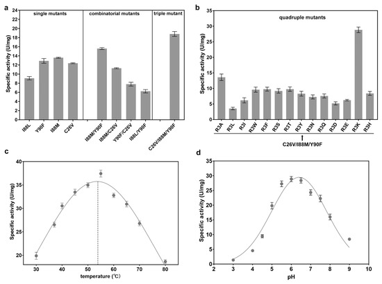 Combinatorial mutagenesis of CjADC and characterization of the mutants. (a) Analysis and comparison of the specific activities of the single mutants, double mutants, and triple mutants. (b) Determination of the specific activities of the quadruple mutants using C26V/I88M/Y90F triple mutant as a template. (c) Determination and characterization of the optimal temperature of the quadruple mutant C26V/I88M/Y90F/R3K. (d) Determination of the optimal pH of the quadruple mutant C26V/I88M/Y90F/R3K. All the experiments were independently repeated in triplicate. The data are shown by as ± s.d.