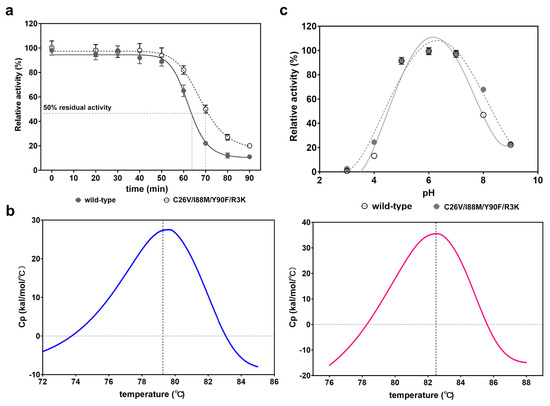 Furthermore, the pH stability between the wild type and the mutant was also determined and compared. The results showed that they had nearly equivalent pH stability in the range of pH 3 to pH 9 (Figure 6c).