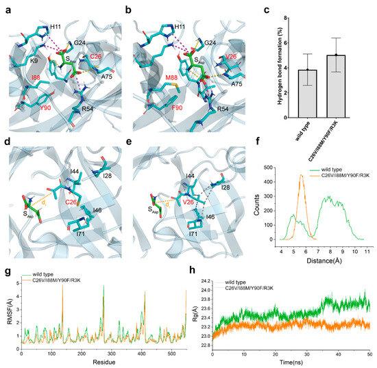Notably, the side chain of C26 was oriented toward a hydrophobic pocket, which was mainly composed of several hydrophobic residues I28, I44, I46, L55, A59, I69, I71, A75, V85, and I87 within a 5 Å distance from C26 (Figure 7d). By introducing a C26V mutation, suitable hydrophobic interactions with I28, I44, I46, and I71 were newly created (Figure 7e). These hydrophobic interactions likely contributed to the stabilization of the active site, allowing the pyruvoyl group in the active site readily react with L-aspartate. To confirm this speculation, the reaction distance (dr) distribution between the active site and the Cα of L-aspartate was calculated. According to Figure 7d,e, the dr in the mutant significantly differed from that in the wild-type enzyme (Figure 7f). Generally, close distances of dr (4–6 Å) favor the reaction, while far distances (7–10 Å) are unfavorable. In the mutant, the dr remained constantly at a low level (5–6.5 Å) throughout the MD simulation.