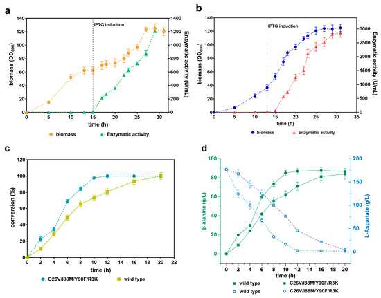 Validation of the efficiency of whole-cell bioconversion using the mutant C26V/I88M/Y90F/R3K. (a) Scale-up fermentation of E. coli (BL21) cells producing wild-type CjADC in a 5 L bioreactor. The left y-axis represents the biomass, while the right y-axis represents the level of produced enzyme. The gray dashed vertical line indicates the induction time with IPTG. (b) Scale-up fermentation of E. coli (BL21) cells producing C26V/I88M/Y90F/R3K in a 5 L bioreactor, presented in a similar manner to (a). (c) Determination of β-alanine conversion efficiency from L-aspartate using the wild-type CjADC and C26V/I88M/Y90F/R3K through a whole-cell bioconversion system. (d) Analysis and comparison of β-alanine production and substrate depletion during the bioconversion process using wild-type CjADC and C26V/I88M/Y90F/R3K through a whole-cell bioconversion system. All the experiments were independently repeated in triplicate. The data are shown as mean ± s.d.