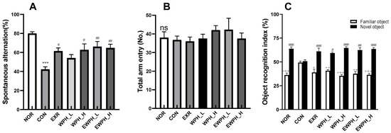 By contrast, the discrimination index for familiar objects significantly increased in the CON group compared to that of the NOR group, but decreased to the level of the NOR group in the EXR, WPH_L, WPH_H, EWPH_L, and EWPH_H groups compared to the CON group. Unlike the NOR, EXR, and WPH groups, the CON group showed similar indices for familiar and novel objects (Figure 1C). This result indicated that both exercise and WPH administration improved the ability of mice to explore novel objects (p < 0.001, Figure 1C). No synergistic effect was observed with the combination of treadmill exercise and WPH.