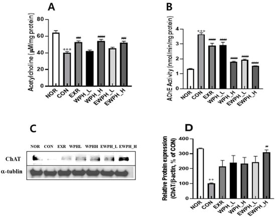 In the mouse brain tissue, the ACh concentration of the CON group was significantly reduced by 0.6 times compared to that of the NOR group (Figure 3A). In addition, the activity of AChE, an ACh-degrading enzyme, was significantly increased by 2.7 times, and the protein level of ChAT was significantly decreased by 3.3 times in the NOR group compared with that of the CON group (Figure 3). These results indicate that the administration of scopolamine reduced ACh levels by increasing AChE activity and decreasing the ChAT protein levels, consequently leading to cognitive dysfunction. Treadmill exercise and WPH administration restored the ACh levels that were reduced by the scopolamine administration (Figure 3A). The ACh concentration significantly increased by 1.3 times in the EXR, WPH_H, and EWPH_H groups compared to that in the CON group (p < 0.01, Figure 3A). The AChE activity significantly decreased by 0.8-fold, 0.8-fold, 0.5-fold, 0.5-fold, and 0.4-fold in the EXR, WPH_L, WPH_H, EWPH_L, and EWPH_H groups, respectively (p < 0.001; Figure 3B). The expression level of ChAT protein was significantly increased by 309.12% in the EWPH_H group compared to that in the CON group (p < 0.05; Figure 3C). The combination of treadmill exercise and a high-dose WPH administration synergistically increased the ChAT protein levels. These results show that both exercise and WPH administration effectively restored ACh levels, which are essential for neurotransmission and cognitive function [20].