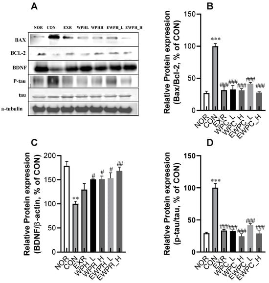 Effect of WPH and treadmill exercise on the relative protein ratios of Bax/Bcl-2, BDNF, and p-tau/tau. NOR, normal; CON, control; EXR, exercise; WPH-L/H, low-dose/high-dose whey protein hydrolysate; EWPH_L/H, exercise + low-dose/high-dose whey protein hydrolysate. Bax, Bcl-2, BDNF, and p-tau, and tau protein levels were determined using Western blot (A), and the Bax/Bcl2 (B), BDNF (C), and p-tau/tau (D) ratios were measured using ImageJ. Data are presented as mean ± standard error of the mean. ** p < 0.01, *** p < 0.001 vs. NOR group; # p < 0.05, ## p < 0.01, ### p < 0.001 vs. CON group (analysis of variance followed by post hoc Tukey’s test).