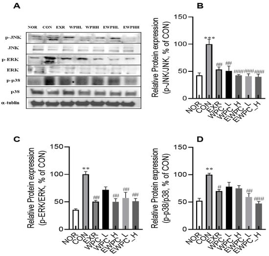 Effect of WPH and treadmill exercise on relative protein expression levels of the mitogen-activated protein kinase (MAPK) signaling pathway. NOR, normal; CON, control; EXR, exercise; WPH-L/H, low-dose/high-dose whey protein hydrolysate; EWPH_L/H, exercise + low-dose/high-dose whey protein hydrolysate. Western blot images of MAPKs (A). Relative protein levels of p-JNK/JNK (B), p-ERK/ERK (C), and p-p38/p38 (D) were determined using Western blot. Data are presented as mean ± standard error of the mean. ** p < 0.01, *** p < 0.001 vs. NOR group; # p < 0.05, ## p < 0.01, ### p < 0.001 vs. CON group (analysis of variance followed by post hoc Tukey’s test).