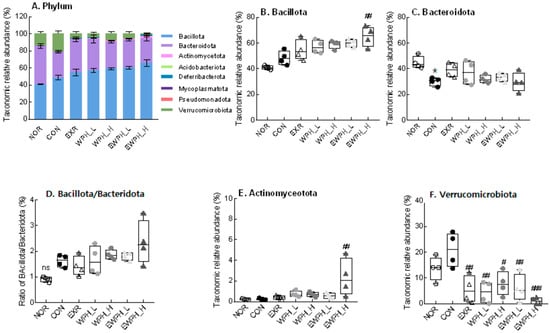 Effect of WPH and treadmill exercise on the gut microbiome composition at the phylum level. Taxonomic abundant compositions (A). The relative abundance of Bacillota (B), Bacteroidota (C), Bacillota/Baceroidota (D), Actinomyceotota (E), and Verrucomicrobiota (F). NOR, normal; CON, control; EXR, exercise; WPH-L/H, low-dose/high-dose whey protein hydrolysate; EWPH_L/H, exercise + low-dose/high-dose whey protein hydrolysate. The gut microbiome at the phylum level was analyzed using rRNA gene sequencing. Data are presented as mean ± standard error of the mean. * p < 0.05 vs. NOR group; # p < 0.05, ## p < 0.01, ### p < 0.001 vs. CON group; ns, non-significant (p > 0.05) (analysis of variance followed by post hoc Tukey’s test).