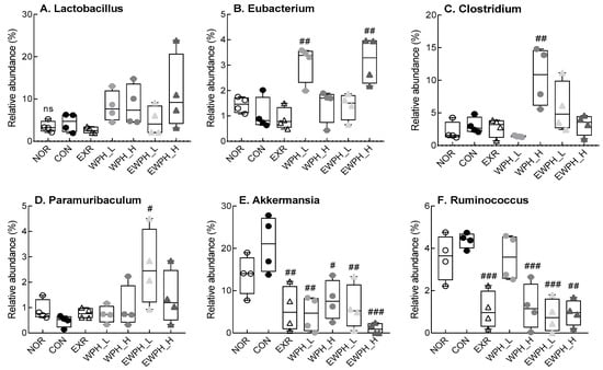 Effect of WPH and treadmill exercise on gut microbiome composition at the genus level. The relative abundance of Lactobacillus (A), Eubacterium (B), Clostridium (C), Paramuribaculum (D), Akkermansia (E), and Ruminococcus (F). NOR, normal; CON, control; EXR, exercise; WPH-L/H, low-dose/high-dose whey protein hydrolysate; EWPH_L/H, exercise + low-dose/high-dose whey protein hydrolysate. The gut microbiome at the genus level was analyzed using rRNA gene sequencing. Data are presented as mean ± standard error of the mean. ns; not significant. # p < 0.05, ## p < 0.01, ### p < 0.001 vs. CON group; ns, non-significant (p > 0.05) (analysis of variance followed by post hoc Tukey’s test).
