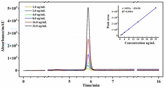 The determination of GAS was conducted utilizing a high-performance liquid chromatography (HPLC) system equipped with a photodiode array detector (PDA) (Shimadzu LC-20A, Kyoto, Japan). Separation of compounds was achieved using a Symmetry C18 column (size: 4.6 × 250 mm, Waters, Ireland) with isocratic elution at a flow rate of 1.0 mL min−1. The column oven temperature was set at 30 °C, and the detector wavelength was set at 220 nm. The mobile phase consisted of a 5% acetonitrile aqueous solution (v/v, acetonitrile, chromatographic grade; ultrapure water), and 20 μL of extracts were injected into the HPLC system. Each run was completed within 16 min. The GAS standard (Sigma, St. Louis, MA, USA) was used for the establishment of calibration curves []. Precisely, 8.0 mg of GAS standard was added in a 50 mL volumetric flask, followed by addition of acetonitrile/water (5:95), and it was shaken properly to obtain a 160 ug mL−1 solution of the standard. The GAS standard diluted to the concentration ranges of 1.0, 2.0, 4.0, 8.0, 16.0 and 32.0 μg/mL was used for the establishment of calibration curves. The standard solutions were measured under the same chromatographic conditions, and the produced calibration linear equation was y = 1451.8x − 426.97, R2 = 0.9994. The chromatogram of standard compounds is shown in Figure 1. The peak area and content of GAS were calculated by an HPLC auto-integrator and calibration curves equation, respectively. Figure S2 presents the chromatogram of the G. elata sample.