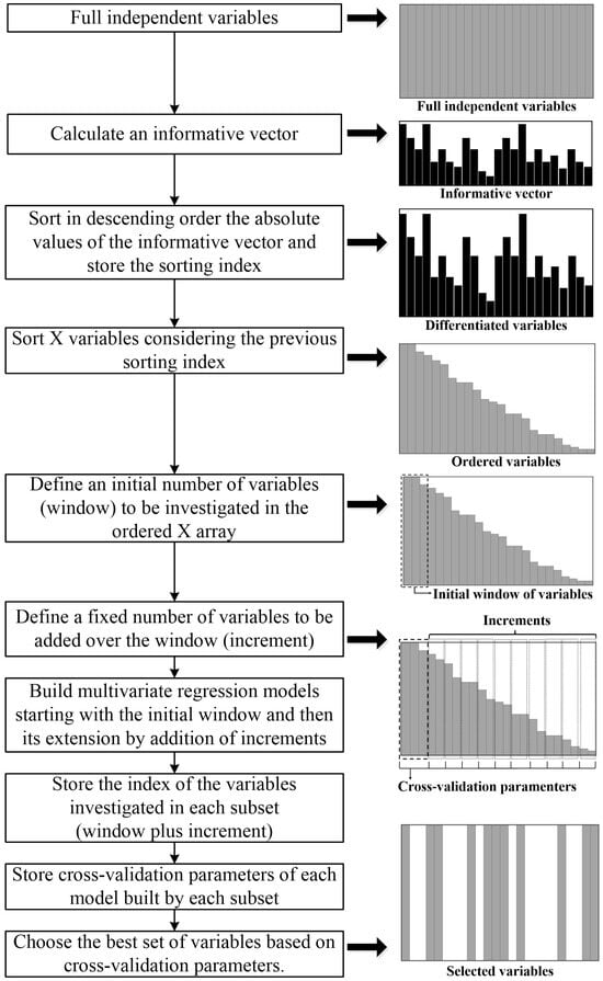 Three OPS methods [], i.e., autoOPS, feedOPS and iOPS, were applied to select more informative variables to improve the models. The OPS method was performed on the basis of calculating an information vector containing information about the optimal independent variable for the prediction. The information vector was derived from the calculation involving the columns of the X matrix (independent variables) and the dependent variable (Y), with a length equal to the number of independent variables. Typically, metrics such as regression coefficient (REG), correlation of each column of the matrix X with y (COR), residual information of the reconstructed matrix with latent variables (SQR), variables importance on projection (VIP), net analyte signal (NAS), and covariance procedure (COV) are employed to compute the information vector. As depicted in Figure 3, the OPS method encompassed the following procedural steps.