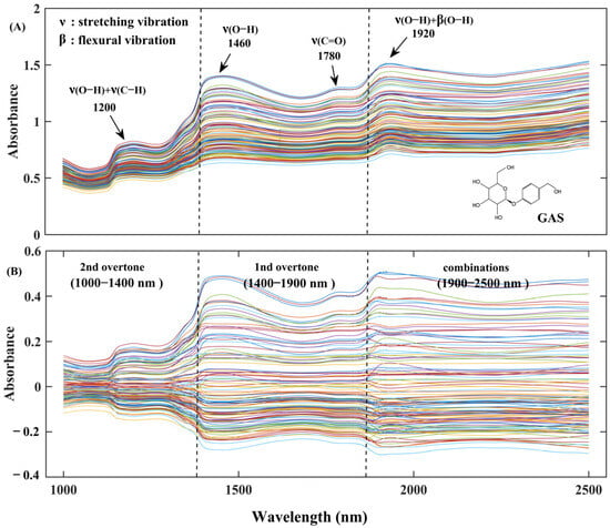 The averaged FT-NIR spectra for all fresh G. elata samples are presented in Figure 4A). The spectra gave rise to characteristic broad and overlapping peaks between 1000 and 2500 nm. All samples presented similar spectral shapes and characteristic spectral regions, such as 1150–1250 nm, 1400–1550 nm, and 1860–2000 nm. Among these spectral signals, the specific peak around 1920 nm was mainly related to combined O-H bands of the water molecules. Energy absorption at bands 1780, 1460, 1200 nm can be highlighted, which reflected the presence of the first and second overtones of the water molecule O-H group []. Phenolics are compounds possessing aromatic ring with one or more hydroxyl groups, while GAS is a polyphenolic substance consisting of two aromatic rings with multiple hydroxyl groups []. The spectral regions between 1400 nm and 1460 nm corresponded to the first overtone of the O-H group of phenol, and 1920 nm is also the combination band of O-H vibrations []. According to previous reports, phenolics should be detected in the regions of 1415–1515 nm, 1650–1750 nm, and 1955–2040 nm [,].