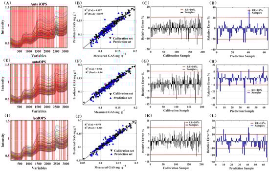 The selected variables for GAS were obtained by iOPS (Figure 5A), autoOPS (Figure 5E) and feedOPS (Figure 5I). The variables selected using the three OPS algorithms were similarly distributed at 2nd overtone, 1st overtone and combination regions. However, autoOPS selected more variables in the combination region, especially in the interval of 1800 to 2200 nm associated with stretching vibration and bending vibration of O-H []. Indications point towards the combination region harboring substantial information conducive to GAS prediction. The application of autoOPS emerges as a universally robust variable screening method, demonstrating its efficacy in significantly enhancing the predictive capabilities of the model.