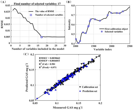 (A) A curve illustrating the RMSE; (B) distributions of characteristic variables using SPA; and (C) scatter plots depicting the correlation between measured and predicted GAS values utilizing MLR with variables selected by SPA (▼ represents the calibration set and ▲ the prediction set).