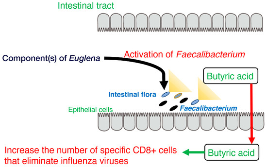 Furthermore, stool volume was increased by the ingestion of Euglena [65], as shown by Asayama et al. [73]. These results are consistent with the findings of Kawano et al. that rats fed a diet containing cholesterol and Euglena had a shorter cholesterol retention time in the intestine than rats fed a diet containing only cholesterol [74]. Dietary fiber intake may increase stool frequency in patients with constipation [75]. The paramylon in Euglena is insoluble and is neither digested nor absorbed. Therefore, it is believed to exert the same effect as a dietary fiber. Moreover, the consumption of Euglena enhanced butyrate production by F. prausnitzii and is consistent with the results of a previous study showing that butyrate supplementation may alleviate defecation disorders [76]. Thus, ingesting Euglena may have beneficial effects on constipation, such as reducing pain during defecation. In addition, butyrate produced in the intestine increases the number of specific CD8+ T cells that eliminate influenza viruses and control the infection [77]. These findings indicate Euglena may contribute to immunomodulation and antiviral activity (Figure 1).