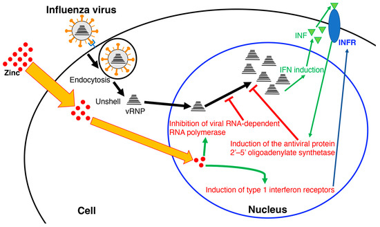 Model of the inhibition of influenza virus replication by zinc. INF: type 1 interferon; INFR: type 1 interferon receptor; vRNP: viral ribonucleoprotein.