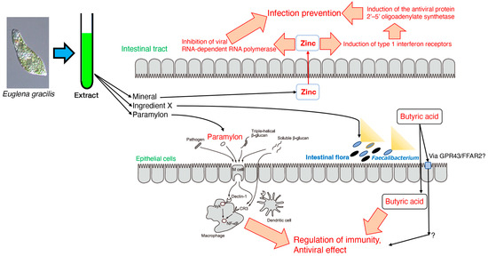 The intake of Euglena may contribute to the suppression of high blood glucose levels [33] and the alleviation of stress-related symptoms [34] via autonomic nervous system balance; nonetheless, the effect of Euglena on the immunological and antiviral activities has not been studied in detail. Moreover, the active ingredients of Euglena, which contains a wide range of nutrients, have not been thoroughly analyzed. Unlike β-glucans from other sources, Euglena also serves as a broad source of vitamins, minerals, amino acids, unsaturated fatty acids, and other nutrients, and thus may exhibit a wide range of mechanisms of action. This review focuses on the immunostimulatory and antiviral activities of Euglena, with particular emphasis on its potential role in the intestinal environment. Furthermore, this review describes the effects of consuming Euglena, with a specific focus on its components.