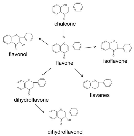 Flavonoids are secondary metabolites that are modified by a wide range of chemical reactions and are ubiquitous in the biosynthetic pathways in plants []. The synthesis of flavonoid compounds, including chalcones, flavonoids, flavonols, anthocyanins, and proanthocyanidins, is a complex process, and their metabolic pathways have been extensively studied using biochemical and molecular biology techniques (Figure 1) [,,].