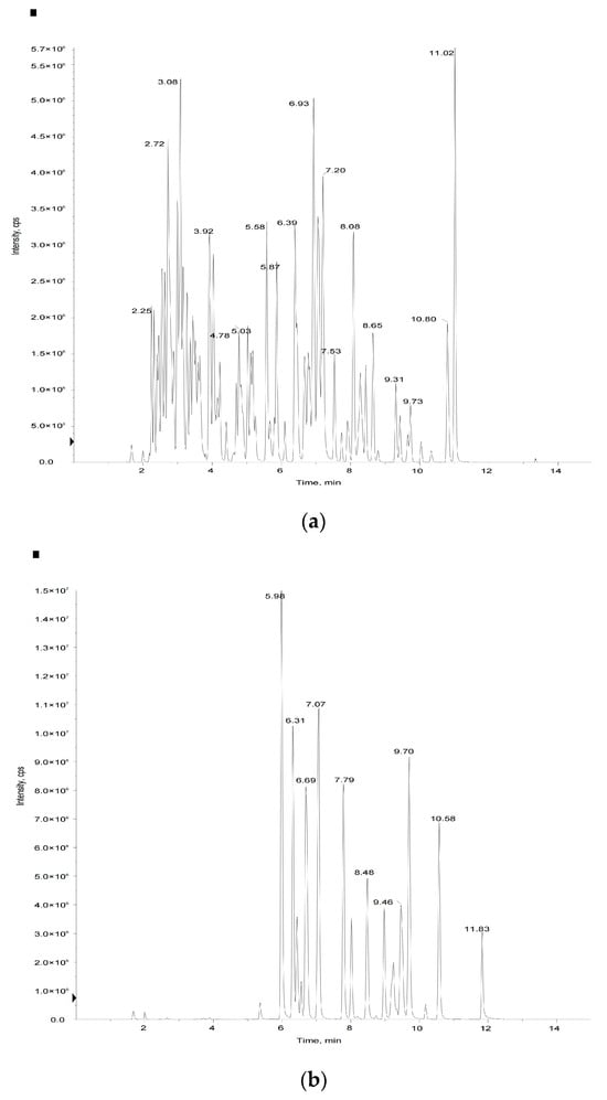 The sample extracts were analyzed using a UPLC-ESI-MS/MS system, ExionLC™ AD (SCIEX, Framingham, MA, USA) coupled with a QTRAP® 6500+ (SCIEX, Framingham, MA, USA) mass spectrometer, which was based on the description by Zhang et al. []. Using [2H6] Daidzein, [2H3] rutin, [13C3]-(+/−)-gallocatechin as internal standard substances, the mixed concentration of these internal standard substances is 4000 nmol/L, with an added scalar of 10 μL and an injection volume of 2 μL. All samples were analyzed using Waters ACQUITY UPLC HSS T3 C18 (100 mm × 2.1 mm i.d., 1.8 µm) at 40 °C. The solvent system was water with 0.05% formic acid as the A phase and acetonitrile with 0.05% formic acid as the B phase. At the beginning of the reaction, gradient elution was set as A/B at 90:10 (V/V); then, A/B was adjusted to 80:20 (V/V) after 1 min, 30:70 (V/V) after 9 min, 5:95 (V/V) after 12.5 min, and 90:10 (V/V) after 13.6 min until the end of the reaction. The gradient elution program protocol was performed as described by Wang et al. []. The eluent was then connected to an ESI-triple quadrupole-linear ion trap (QTRAP)-MS.