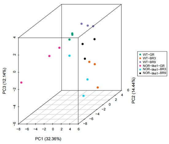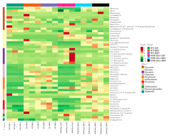 During the BR3 stage, nine differential flavonoids (six upregulated and three downregulated) were identified between WT-BR3 and NOR-like1-BR3 (Figure 8a). During the BR9 stage, 12 differential metabolites (11 upregulated and 1 downregulated) were identified between WT-BR9 and NOR-like1-BR9 (Figure 8b). During the GR stage, 16 differential metabolites (13 upregulated and 3 downregulated) were identified between WT-GR and NOR-like1-GR (Figure 8c).