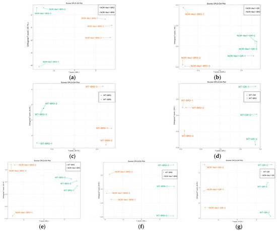 OPLS-DA model plots and loading plots of pairwise comparisons between the different tomato sample groups: (a) NOR-like1-BR3 vs. NOR-like1-BR9 (R2X = 0.786, R2Y = 0.993, Q2 = 0.63); (b) NOR-like1-GR vs. NOR-like1-BR3 (R2X = 0.626, R2Y = 0.999, Q2 = 0.822); (c) WT-BR3 vs. WT-BR9 (R2X = 0.594, R2Y = 0.989, Q2 = 0.771); (d) WT-GR vs. WT-BR3 (R2X = 0.75, R2Y = 0.999, Q2 = 0.943); (e) WT-BR3 vs. NOR-like1-BR3 (R2X = 0.755, R2Y = 0.955, Q2 = 0.632); (f) WT-BR9 vs. NOR-like1-BR9 (R2X = 0.585, R2Y = 0.998, Q2 = 0.752); (g) WT-GR vs. NOR-like1-GR (R2X = 0.726, R2Y = 0.999, Q2 = 0.891).