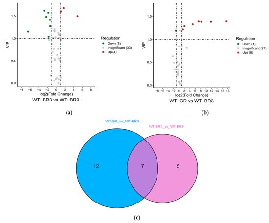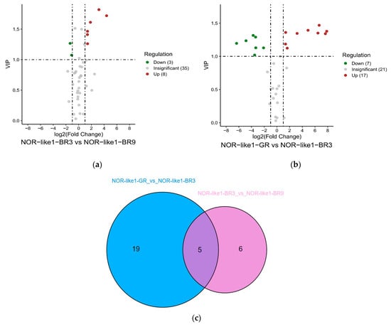 The differential metabolite analysis results at different ripening stages in NOR-like1 tomato fruits: (a,b) Volcano plot showing the differential metabolite expression levels among NOR-like1-GR vs. NOR-like1-BR3 and NOR-like1-BR3 vs. NOR-like1-BR9, respectively. (c) Venn diagram showing the differential metabolites from different ripening stages in NOR-like1 tomato fruits.